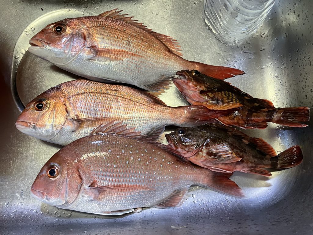 あまり釣れなかった仲間に真鯛2枚あげて、我が家のおかずはこんな感じ。