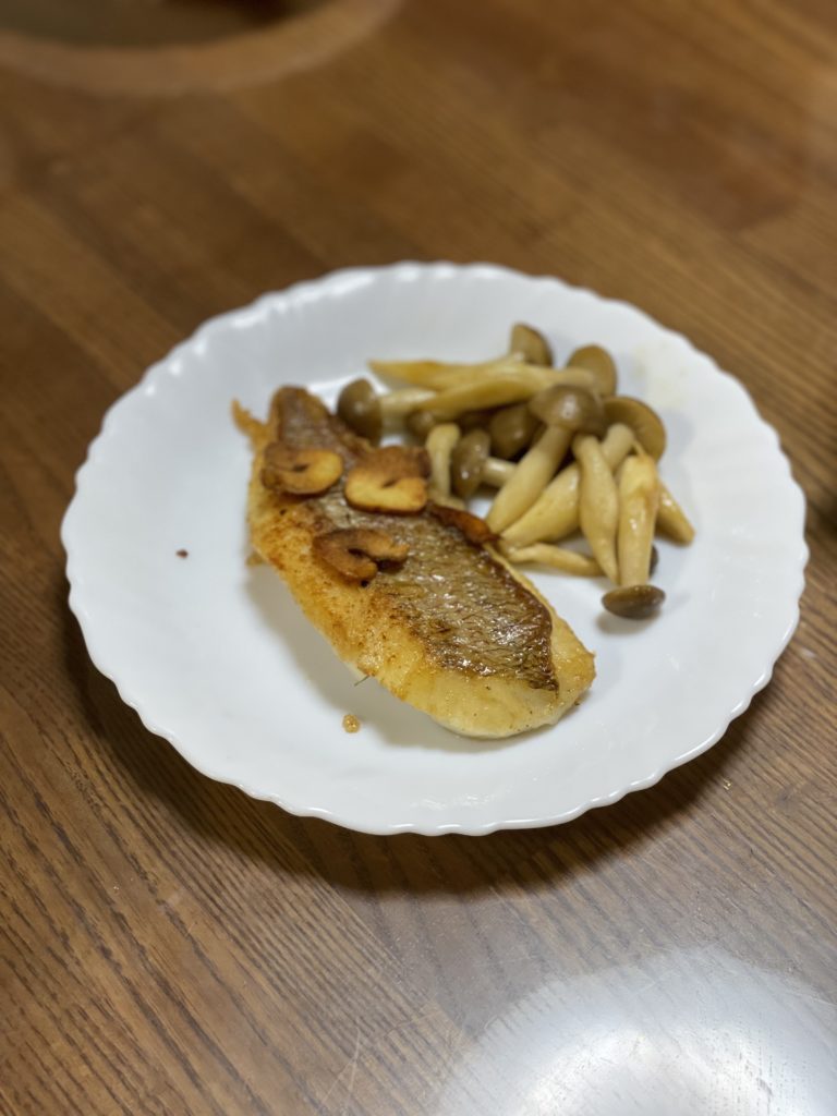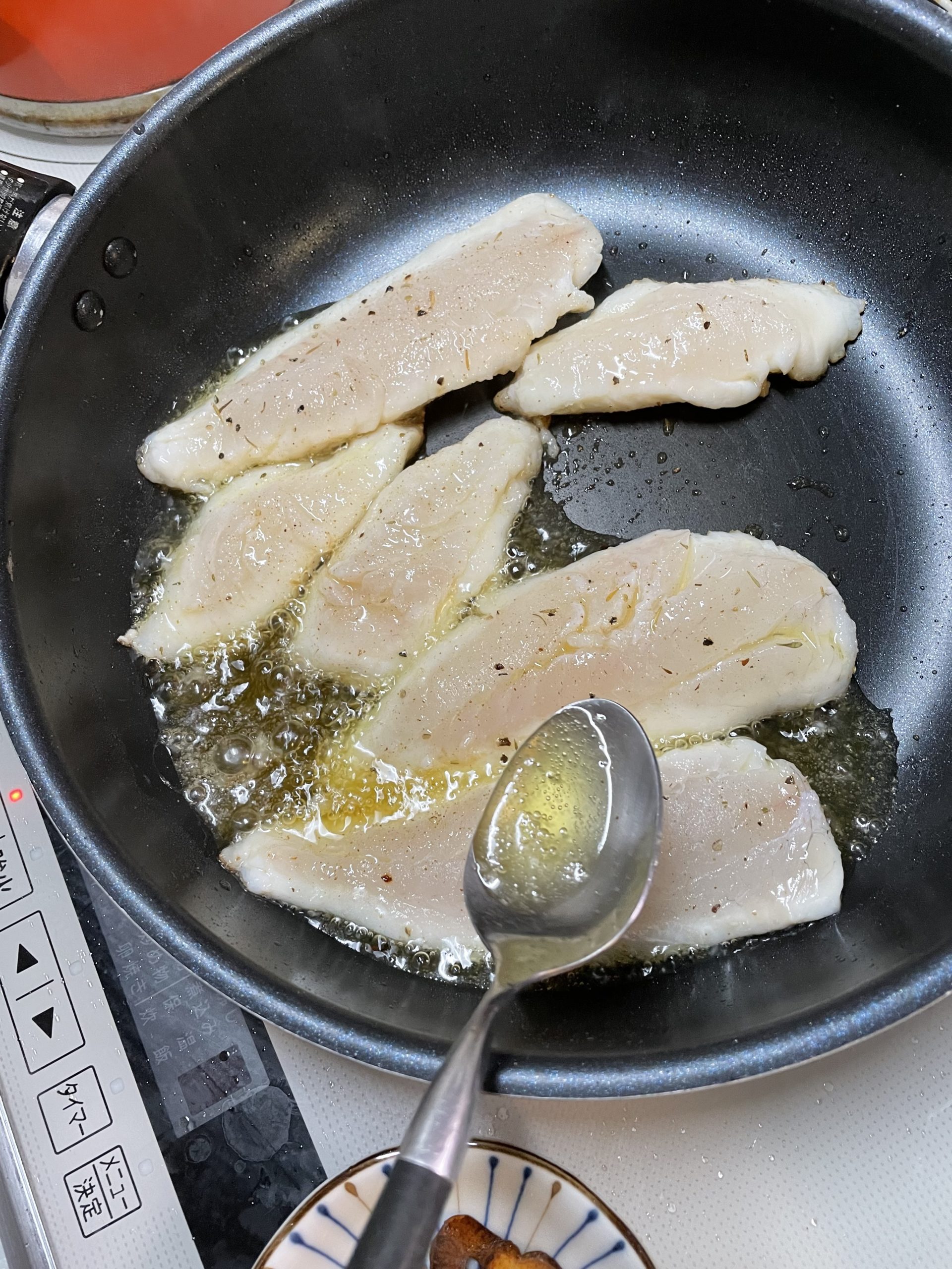 - にんにくを取り出したオリーブオイルに真鯛の皮側を下にしてしばらく焼く(焼いている間、スプーンでオリーブオイルをすくって、身にかける)